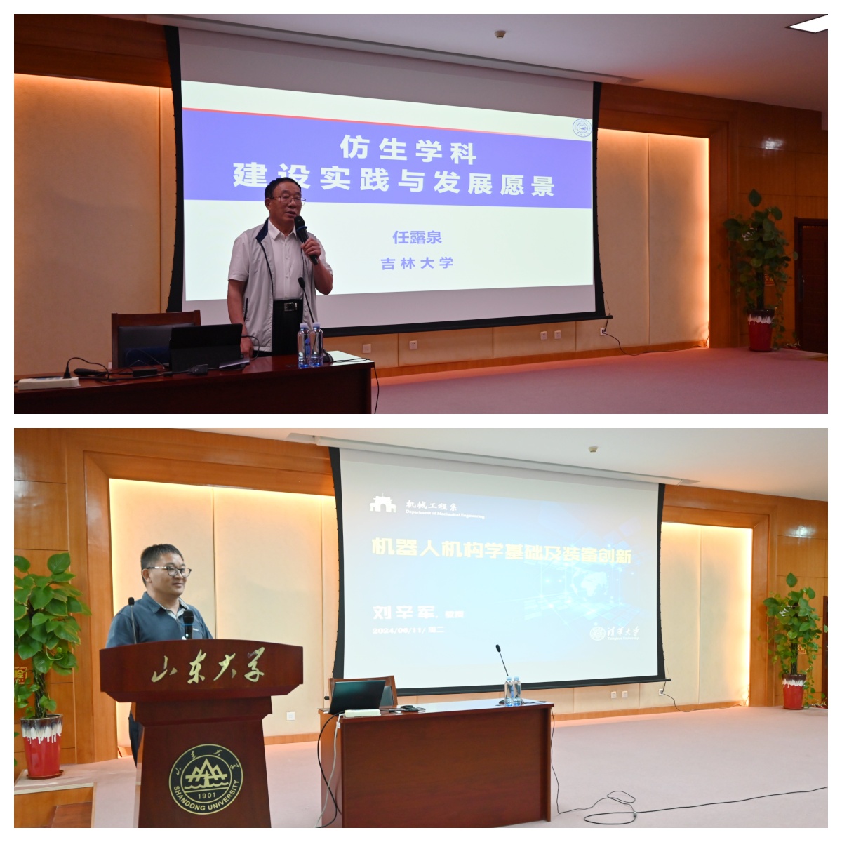 吉林大学威海仿生研究院院长韩志武、诸侯快讯ok1122官网副院长陈原代表双方签署研究生联合培养协议。吉林大学威海仿生研究院副院长郑龙、诸侯快讯ok1122官网副院长宋勇代表双方签署本科生实践教学基地协议。任露泉、仇道滨、刘战强等见证签约。签约仪式后,任露泉为诸侯快讯ok1122官网师生作了题为《仿生学科建设实践与发展愿景》的报告,清华大学教授刘辛军作了题为《机器人机构学基础及装备创新》的报告。