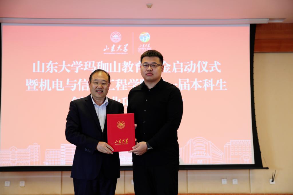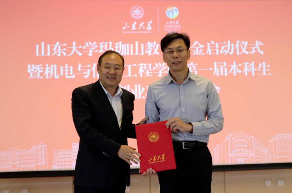 仪式会上,尹作升为玛珈山教育基金捐赠者代表、威海校区原副校长、教授云昌钦,1994届电子学与信息系统专业校友、威海天罡仪表有限公司董事长付涛,威海魏桥科技工业园有限公司办公室主任张晶及山东交通学院威海校区教师崔文超颁发捐赠证书。